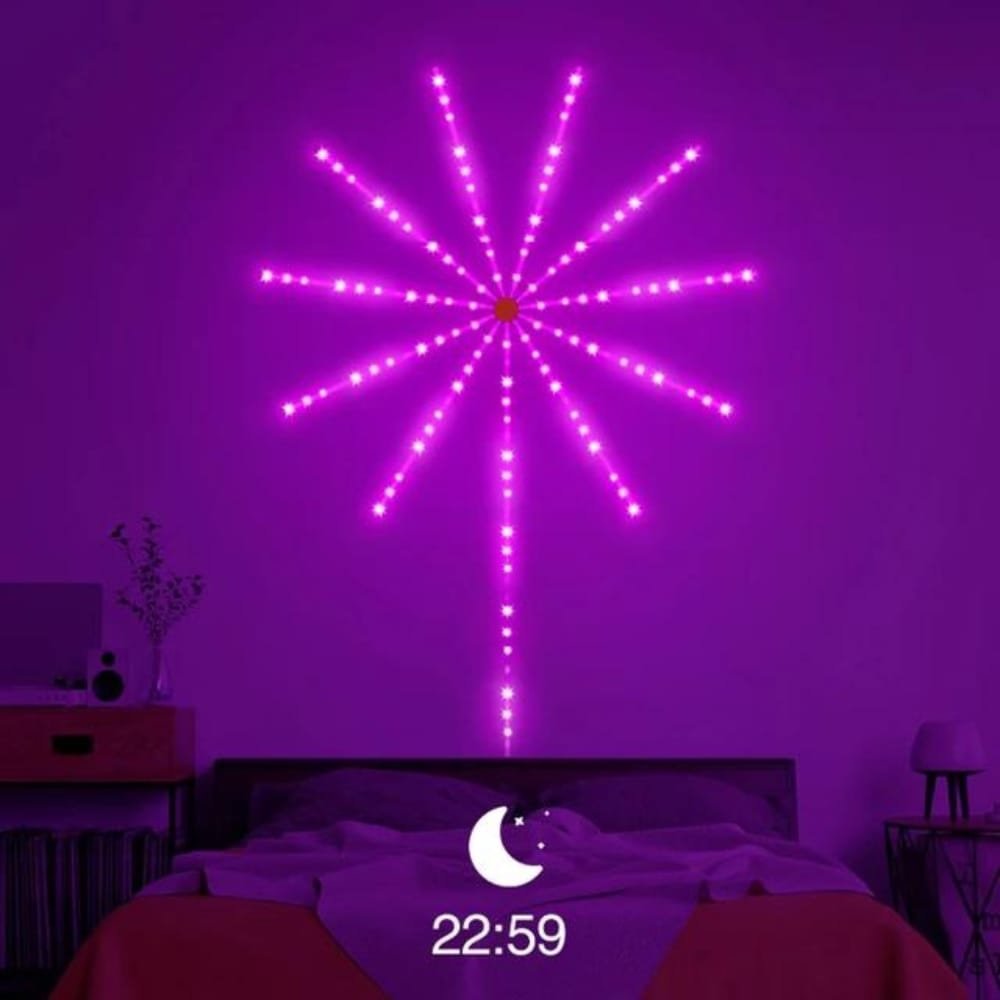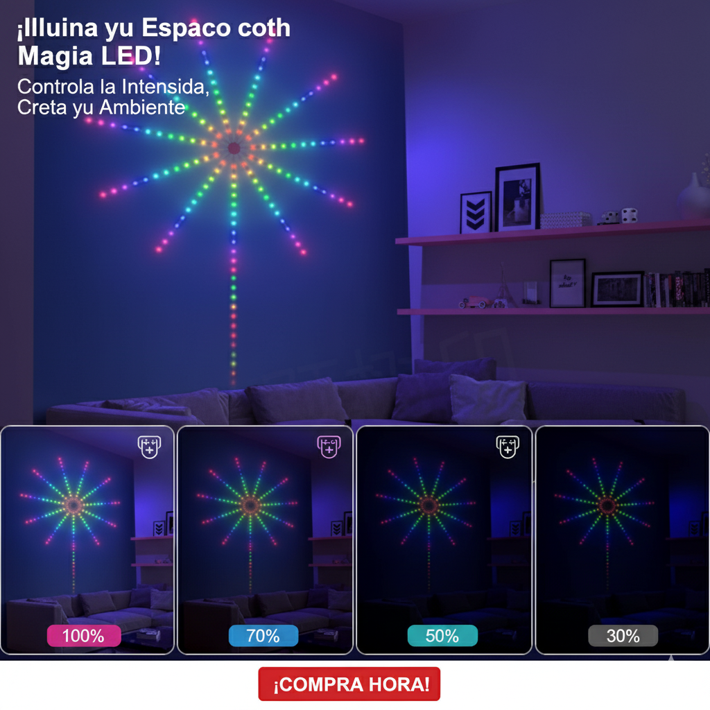 El LED de alto lumen lo hace ideal para decorar su sala de estar, dormitorio, porche, especialmente ideal para vacaciones y eventos como Navidad, Halloween, fiestas, aniversarios. Es un gran regalo para tu familia y amigos. Aniversarios, fiestas, festivales, Navidad.Impresionante efecto de lanzamiento y explosión11 tiras cortas de LED y 1 tira larga de LED imitan el efecto de una explosión de fuego lanzada en el cielo. Es especialmente impresionante cuando hay varias luces en la pared.24 patrones + 3 modos de ritmo musicalLa luz está integrada con 24 patrones preestablecidos de espectáculos de luz y 3 modos de ritmo musical. Todo controlado por el control remoto en el paquete, el controlador rápido en el cable USB y la aplicación Bluetooth. También puedes ajustar el brillo y la velocidad usando estas tres formas. Con el micrófono sensible oculto en el controlador, la luz puede pulsar con la música que recoge. Los 3 modos de ritmo musical definitivamente le darán un espectáculo de luz impresionante con su música/canción favorita.Asegúrate de que la pared esté limpia y seca. Usa el adhesivo en la parte posterior de la caja de control redonda para colocarlo en la pared. Inserta y pega las tiras de luz en la pared una por una. La tira larga debe ser la que tenga un cable USB. Conecta el cable a cualquier adaptador USB o a un banco de energía. Disfruta del espectáculo de luces.Luces de fuegos artificiales inteligentes para decoración de dormitorioCrea un ambiente maravilloso para ti y disfruta de tu fiesta visual de iluminación. 16 millones de colores, 213 modos dinámicos, sincronización de música, modos de micrófono y temporizador, etc.El paquete incluye, un control remoto, qr para descargar la app, y dispositivo de tiras leds en forma de estrella o fuegos artificiales.